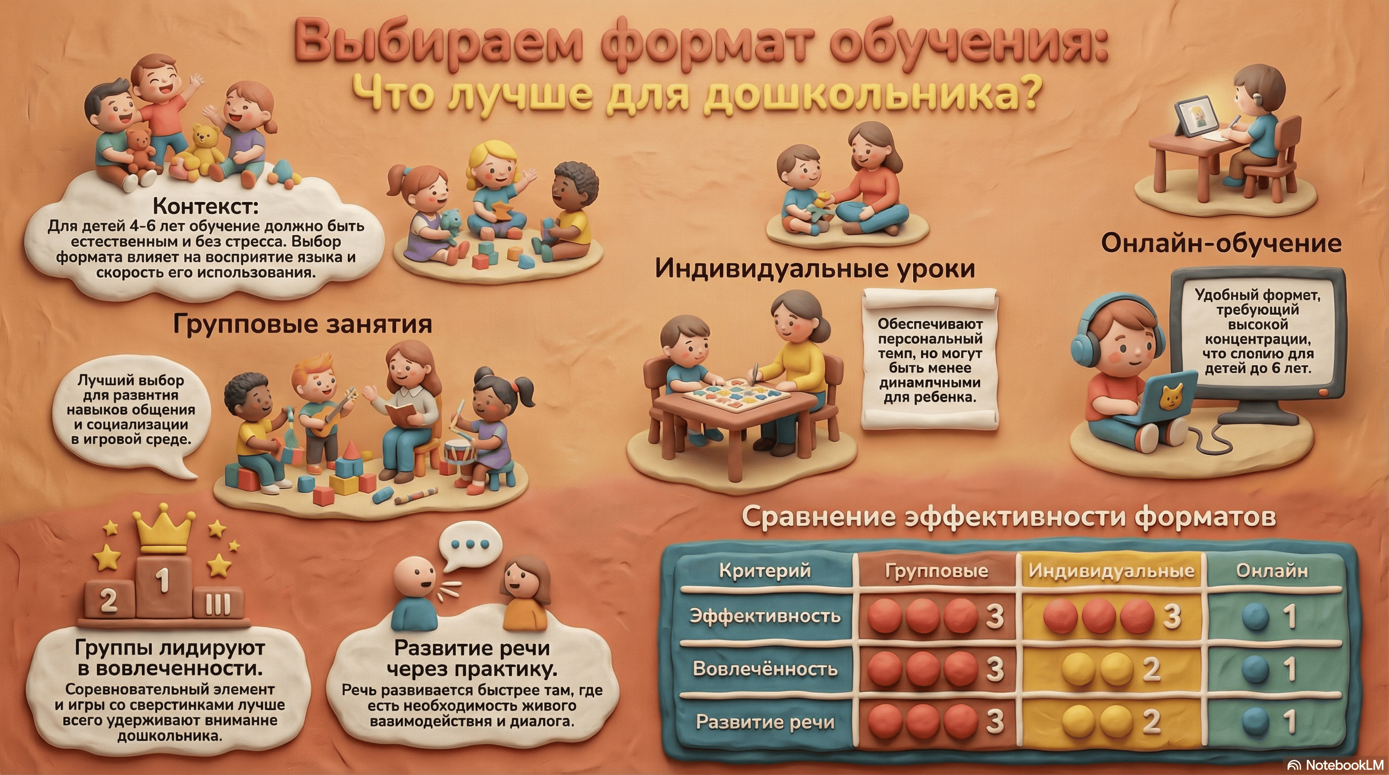 Групповые занятия развивают коммуникацию и социализацию. Индивидуальные — дают больше внимания, но могут быть менее динамичными. Онлайн подходит не всем детям из-за сложности удержания внимания.