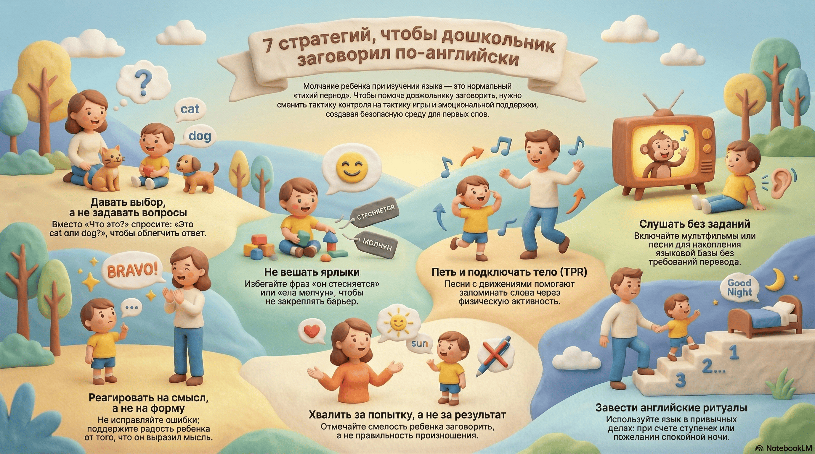 Последний пункт особенно важен: если ребёнок вообще не реагирует на английскую речь — ни жестом, ни взглядом — это уже не тихий период. Это может быть сигналом для консультации с логопедом или детским психологом.