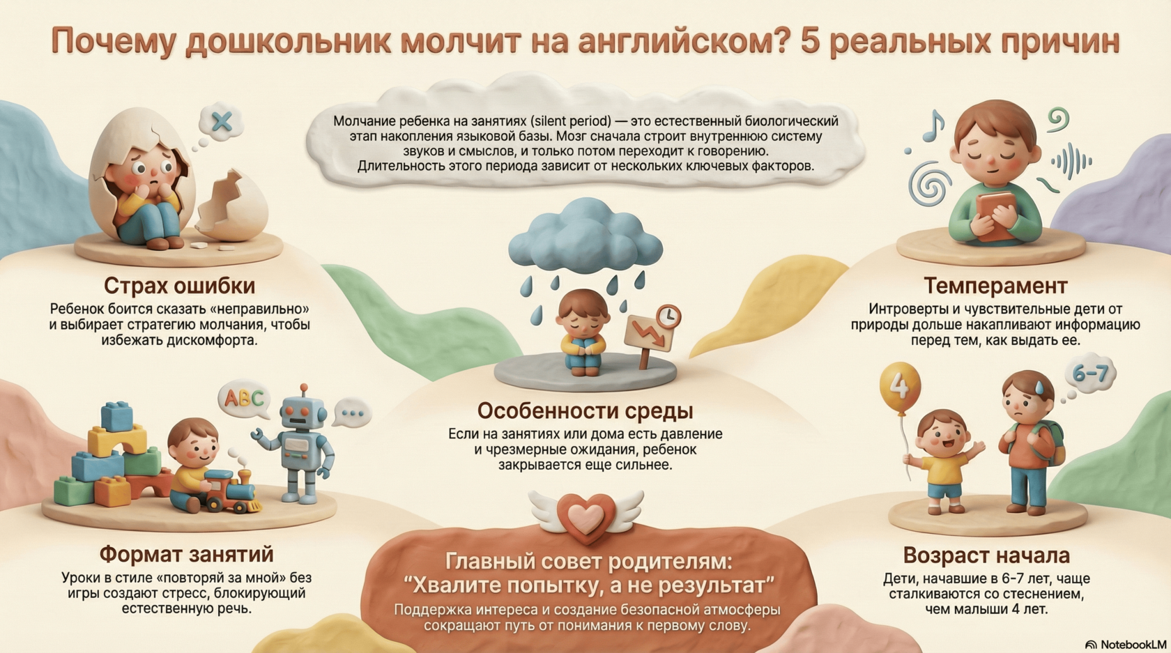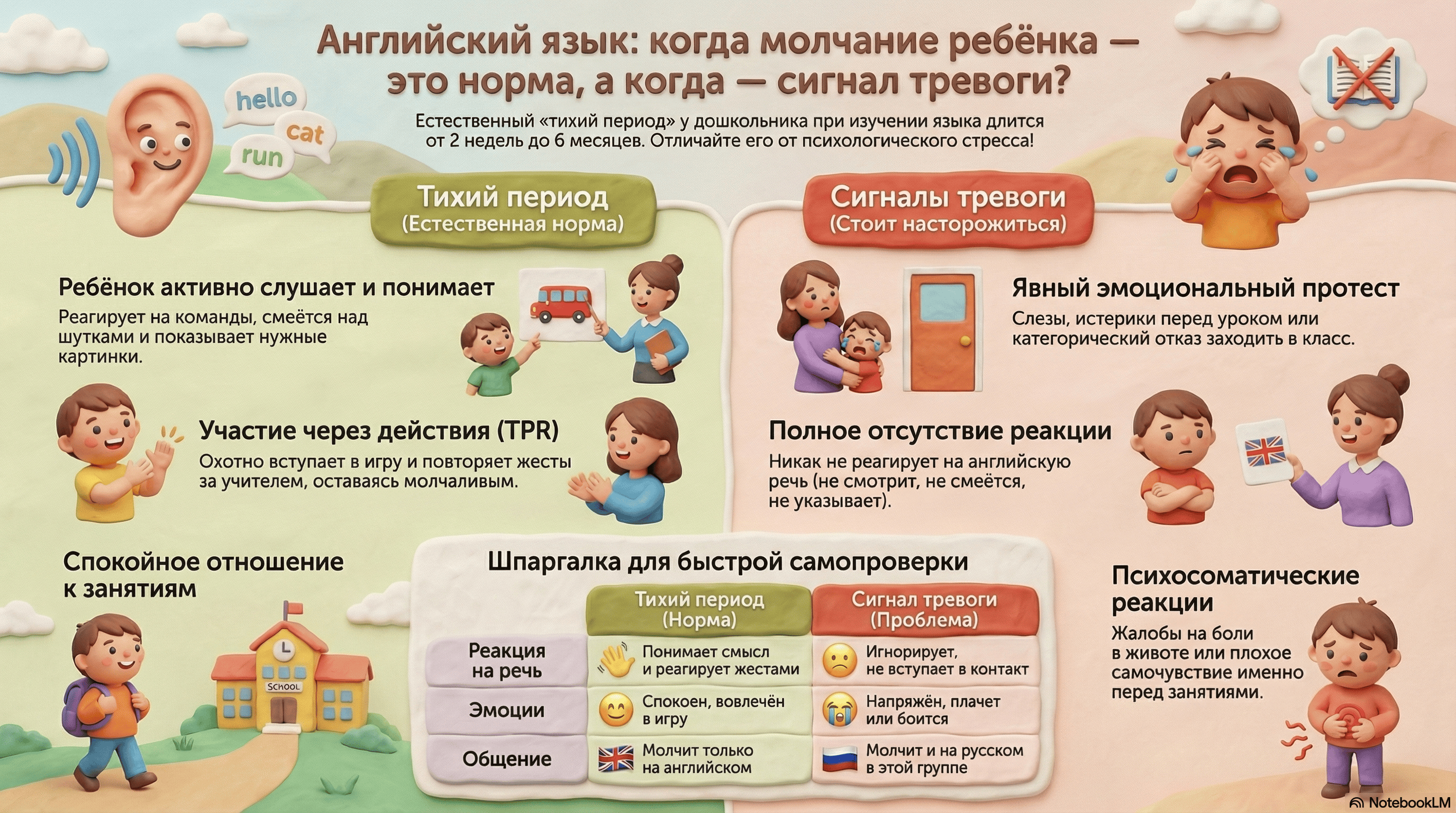 Если молчание сопровождается слезами или физическими реакциями перед занятиями, если ребёнок молчит не только на английском, но и на русском в любой группе сверстников, или если он вообще не реагирует на английскую речь (не смотрит, не смеётся, не показывает) — это повод обратиться к детскому психологу или логопеду. Тихий период — это «слышу и понимаю, но пока не говорю». Всё, что выходит за эти рамки, заслуживает отдельного внимания.