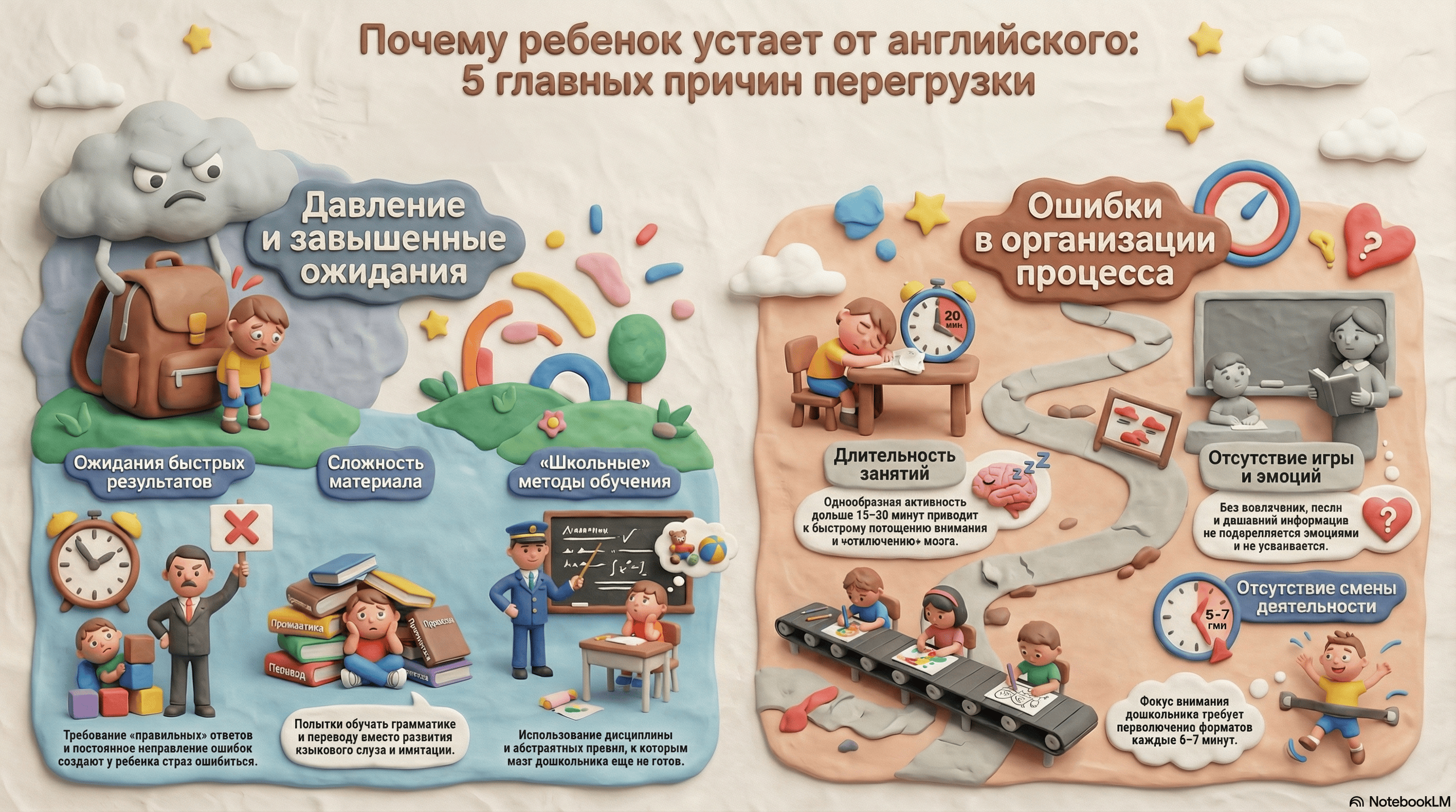 Перегрузка чаще всего возникает не из-за количества занятий, а из-за их формата. Слишком сложный материал, отсутствие смены активности, попытки объяснять «как в школе» — всё это делает обучение тяжелым.