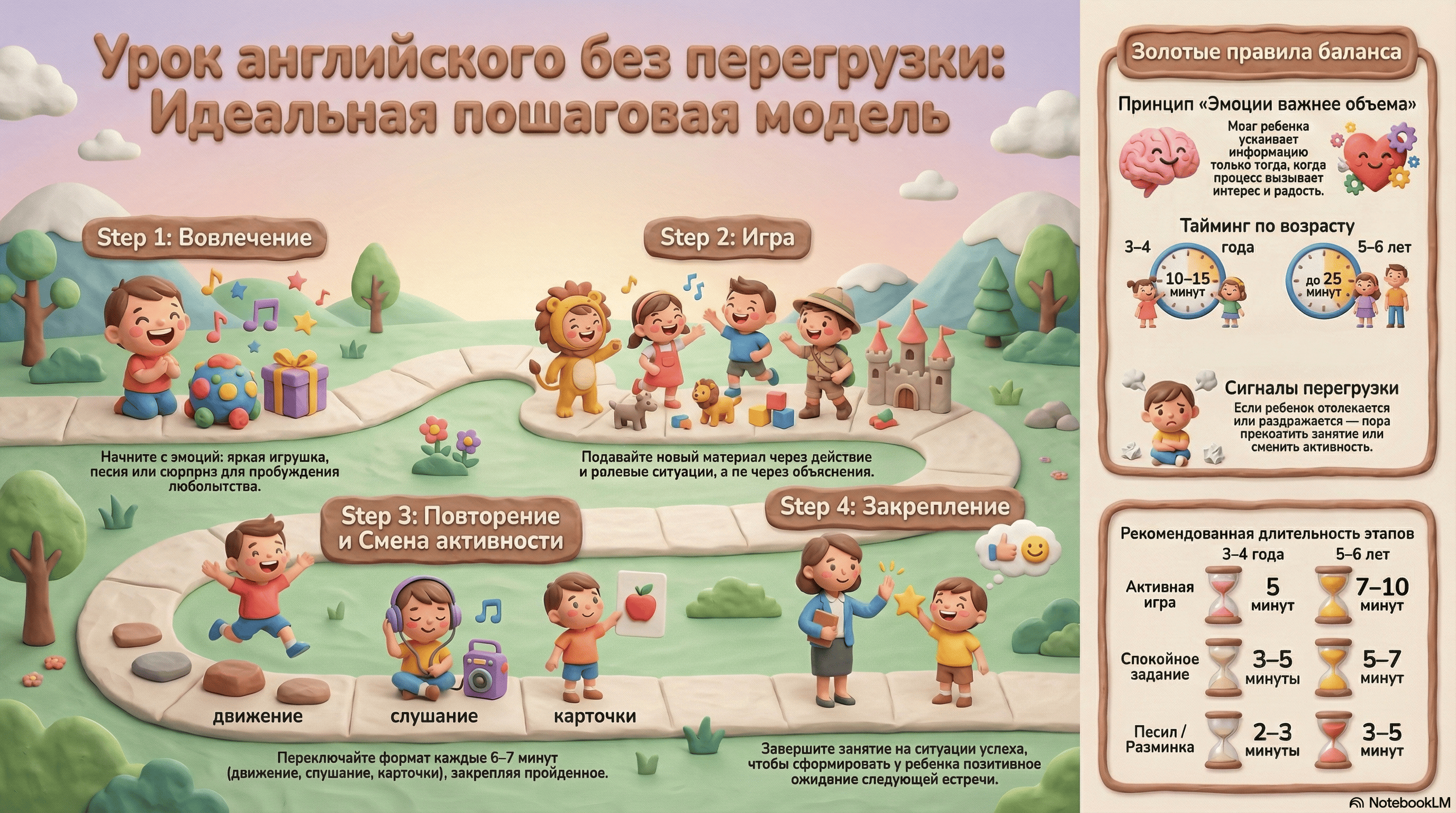 Также важна смена активности каждые 5–7 минут — это помогает поддерживать внимание и снижает утомляемость.