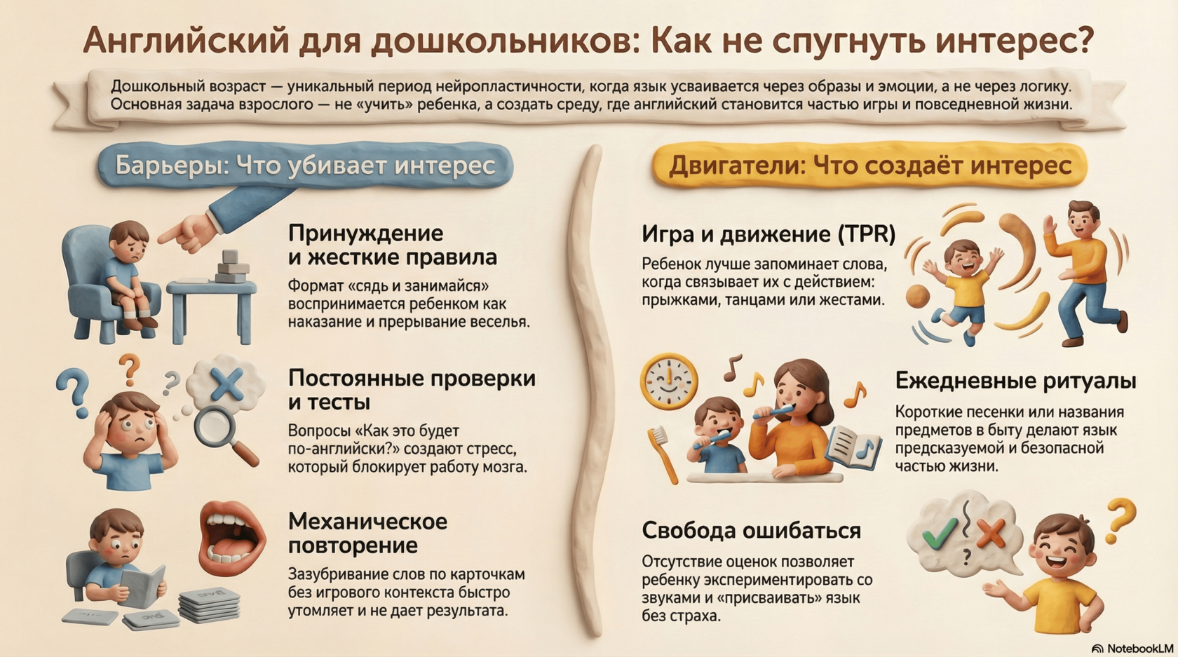 Типичная сцена: мама садится с пятилетним сыном, раскладывает карточки и начинает: «Смотри — это apple, повтори». Малыш повторил один раз, потом взял карточку и начал строить из неё домик. Мама расстроилась — «не хочет учиться».