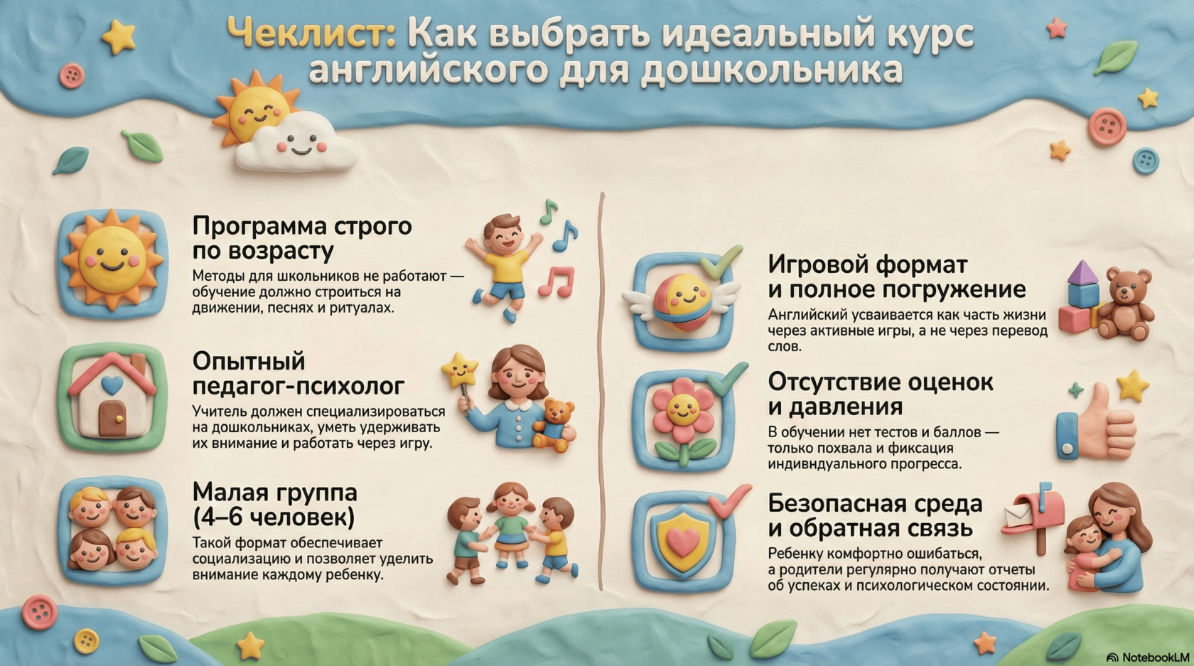 Момент, когда родитель понимает: домашней практики достаточно для поддержки интереса, но для системного результата нужен педагог — это нормально и правильно. Профессиональный преподаватель умеет делать то, что сложно воспроизвести дома: удерживать внимание группы детей, вводить язык через методически выверенные игры, фиксировать прогресс.